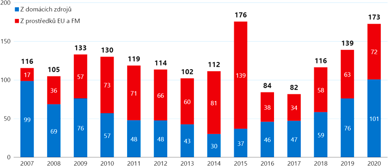 Kapitálové výdaje v roce 2020 meziročně vzrostly téměř o čtvrtinu (+33,5 mld. Kč). Jejich objem (172,7 mld. Kč) téměř dorovnal rekordní rok 2015 (175,7 mld. Kč), který byl na rozdíl od roku 2020 výrazně podpořen investicemi ze společných programů EU a ČR vrcholící fáze programového období 2007–2013. V případě právě skončeného roku byly investice posíleny nejvíce z národních zdrojů ve výši, která poprvé překročila hranici 100 mld. Kč (103,8 mld. Kč při růstu o 24,7 mld. Kč). Vývoj kapitálových výdajů viz graf 7. Rozhodující roli měly investiční transfery Státnímu fondu dopravní infrastruktury (+41,0 %, tj. +18,4 mld. Kč). Vzrostly i transfery určené na investice municipalit (+21,5 %, tj. +5,9 mld. Kč) a investiční nákupy a související výdaje Ministerstva vnitra a Ministerstva obrany (+4,1 mld. Kč).