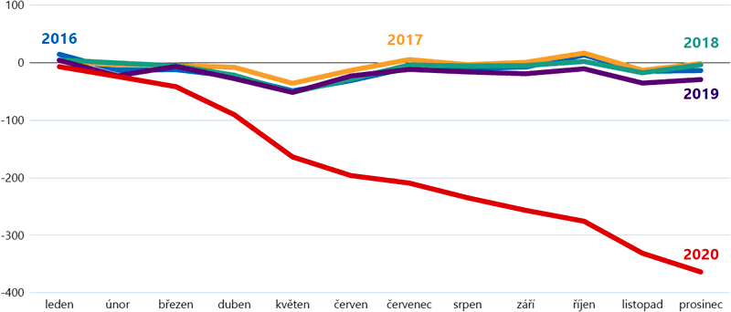 Celkový vývoj hospodaření státního rozpočtu v průběhu roku 2020 je ve srovnání s předchozími lety vidět na grafu 8.