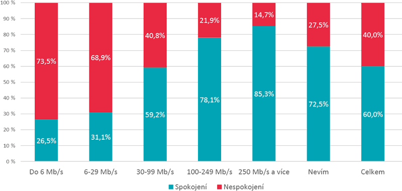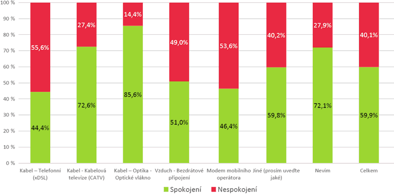 - Celkově došlo k nárůstu spokojenosti respondentů s kvalitou připojení o 4 % (60 % respondentů). Jsou nicméně patrné významné regionální rozdíly – nejnižší spokojenost je v Karlovarském, Středočeském a Pardubickém kraji (cca 52 % nespokojených respondentů), nejvyšší spokojenost naopak v Plzeňském kraji (pouze 32 % nespokojených respondentů);