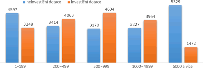 Neinvestiční dotace zaznamenaly v roce 2020 značný růst. Na celkových příjmech se podílely 15 %. U největších obcí to bylo 18 %, u nejmenších obcí pak 15 %. U ostatních velikostních kategorií to bylo kolem 12 %. U nejmenších obcí se jejich objem meziročně zdvojnásobil, u navazující kategorie vzrostl o téměř 80 %. Poté se dynamika snižovala až k 27 % u největších obcí.