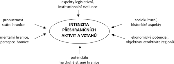 Intenzitu přeshraniční spolupráce totiž neovlivňují pouze institucionální a ekonomické faktory (strukturální podmínky), či různé regionální, národní nebo evropské dotační programy podporující přeshraniční spolupráci. Do procesu vzniku, intenzity a hloubky přeshraniční spolupráce vstupují i další prvky, např. to, jak je samotná hranice propustná (ať už morfologickým typem krajiny, sítí hraničních přechodů, nebo ve smyslu legislativním, založeném na partnerských vztazích sousedních států). Do mechanismu vstupují i další faktory utvářející intenzitu přeshraniční spolupráce (viz obrázek).