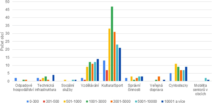 Asi nikoho nepřekvapí, že nejvíce aktivit v rámci přeshraniční spolupráce měst a obcí se realizuje v oblasti kultury a sportu, přičemž sem lze zahrnout jak běžné neinvestiční projekty a aktivity, tak i ty investiční, které se mohou do jisté míry prolínat s další speciální tematickou skupinou – cyklostezky. Z pohledu případného nevyužitého potenciálu nás ale zaujaly zejména v pořadí další oblasti, ve kterých dotazované municipality realizují nebo realizovaly v minulosti přeshraniční meziobecní spolupráci, a to v oblastech jako odpadové hospodářství, sociální služby, správní činnosti, veřejná doprava či mobilita seniorů, jak je vidět více v následujícím grafu pohled starostů a starostek z české strany. Na základě aplikovaného klastrového dělení podle velikost municipality nelze identifikovat žádné zásadní rozdíly, možná jen, že menší obce se zapojují všeobecně méně, nebo v oblastech kultury a sportu jsou zase nejaktivnější municipality v rozmezí 1001–3000 obyvatel. Podrobněji viz graf 2.
