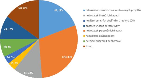 V rámci šetření na avizovaném vzorku jako největší nevýhody či bariéry se ukázaly administrativní náročnost, nedostatek personálních či finančních kapacit nebo absence vhodné dotační výzvy a jiné nespecifikované faktory. Mezi dalšími potenciálními bariérami pro realizaci přeshraniční meziobecní spolupráce byly identifikovány nezájem ostatních měst a obcí z ČR či zahraničí nebo nedostatek jiných než personálních či finančních kapacit.