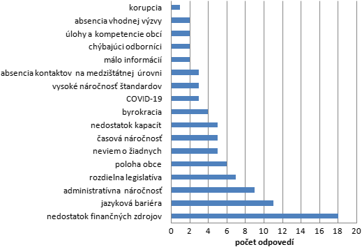 Z výsledků dotazníkového šetření je možné konstatovat, že nejčastější bariérou pro realizaci přeshraniční spolupráce jsou zejména chybějící finance (18 % respondentů), jelikož kvůli absenci dotačních výzev nejsou obce schopny projekty a spolupráci dlouhodobě udržovat. Respondenti dále uvedli jako negativum přeshraniční spolupráce administrativní náročnost realizace projektů (9 % respondentů), rozdílnou legislativu zúčastněných státu (7 % respondentů) a i jazykovou bariéru (11 % respondentů). Podrobně viz graf 6.