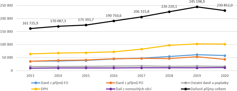 Proti roku 2013 došlo k růstu celkových příjmů o 89,0 %. Vzrostly především daňové příjmy (+51,6 %, tj. +24,1 mld. Kč) a transfery (+110,7 %, tj. +97,1 mld. Kč). Mezi roky 2019 a 2020 došlo k růstu celkových příjmů, ale v důsledku poklesu daňových příjmů byl meziroční růst pomalejší než v předešlém roce (viz graf 1).