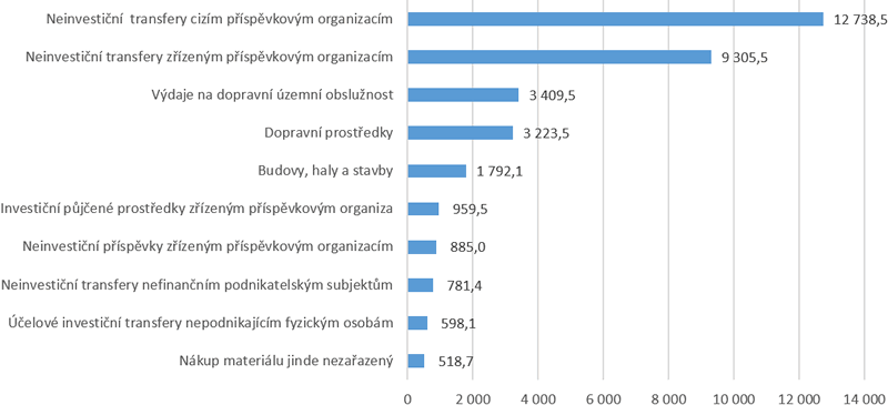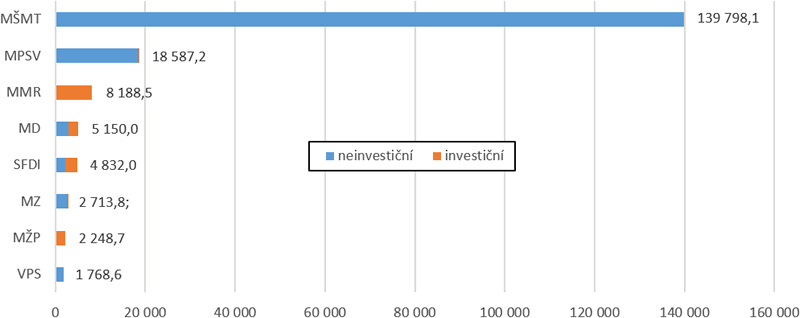 Největší objem transferů obdržely kraje z MŠMT (139,8 mld. Kč) a MPSV (18,6 mld. Kč). V obou případech šlo o transfery neinvestiční určené na přímé náklady na vzdělávání a na sociální služby. Naopak nejvíce investičních transferů pocházelo z MMR (8,2 mld. Kč). Graf 2 zobrazuje nejvýznamnější poskytovatele investičních a neinvestičních transferů do rozpočtu krajů.