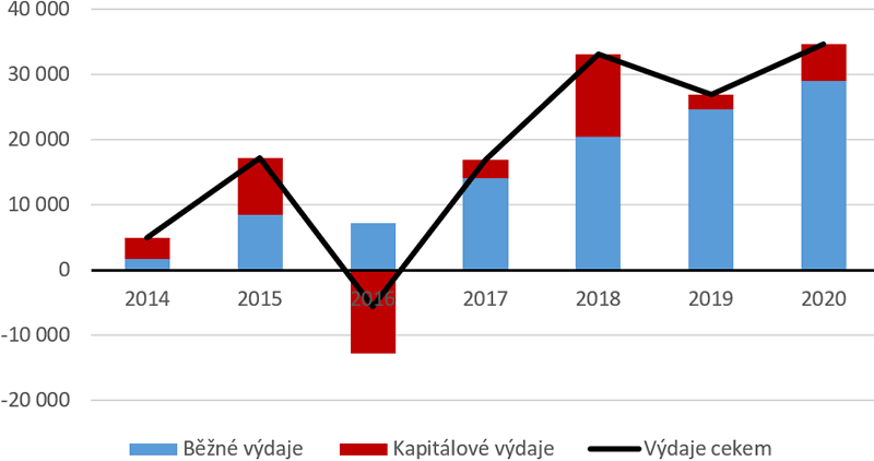 Celkové výdaje se proti roku 2013 zvýšily o 92,5 %. Běžné výdaje vzrostly o 85,7 % na 229,5 mld. Kč. Kapitálové výdaje se zvýšily o 147,8 % na 37,9 mld. Kč, což bylo způsobeno zejména významným meziročním růstem kapitálových výdajů mezi roky 2017 a 2018, kdy od roku 2016 kapitálové výdaje každoročně rostou.