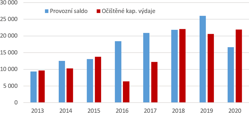 Kraje v roce 2020 realizovaly nejvyšší kapitálové výdaje od roku 2013 z vlastních zdrojů, a to i přes významný meziroční propad provozního salda, které bylo nejnižší od roku 2016. Investiční akce realizované z vlastních zdrojů významně převýšily v roce 2020 provozní saldo a kraje tak plně využily svůj investiční potenciál (graf 5).