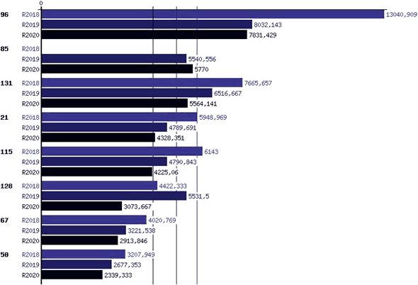 Obr. 1. ukazuje příklad základního výběru ukazatele výkonnosti – počet úkonů v agendě Občanské průkazy na 1 zaměstnance agendy, na úřadech měst se správním obvodem ORP o velikosti 40–50 tis. obyvatel, s výsledky za 3 roky včetně mediánů za tento výběr v jednotlivých letech.
