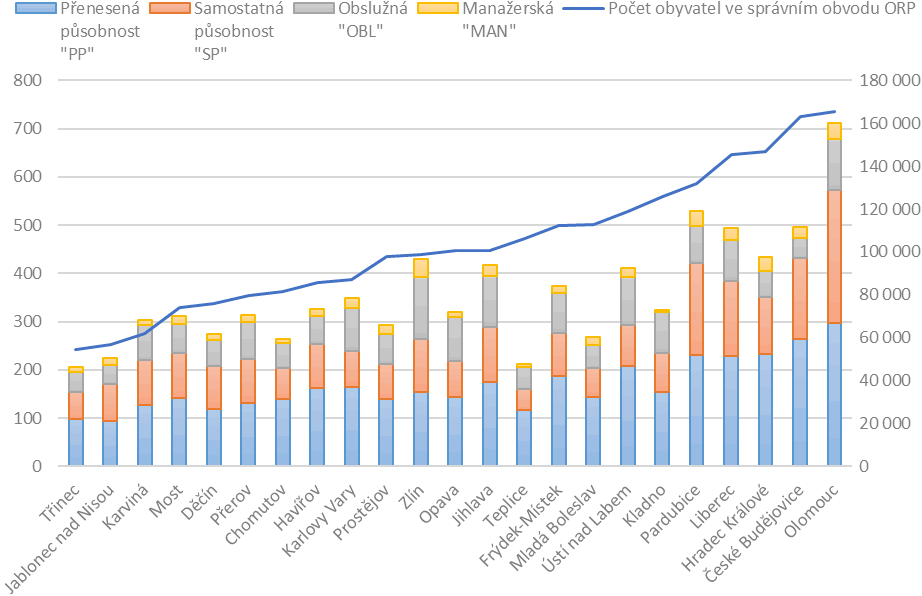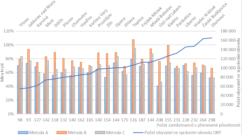 Obecně lze tedy říct, že s narůstajícím počtem úvazků v přenesené působnosti míra krytí klesá. Ze statistik takto vybočuje Olomouc, která má o 10 % více úředníků než České Budějovice pro stejně velký obvod. Na druhé straně stojí například Teplice nebo Kladno s relativně malým aparátem a mírou krytí blížící se ke 100 %.