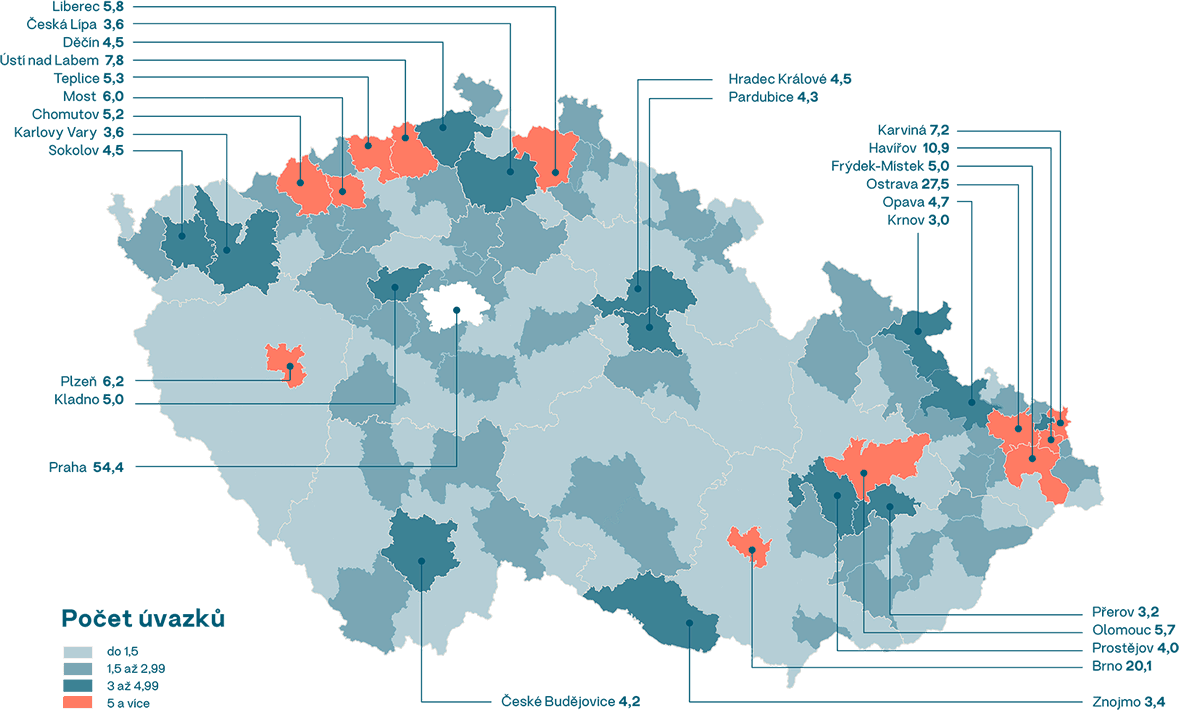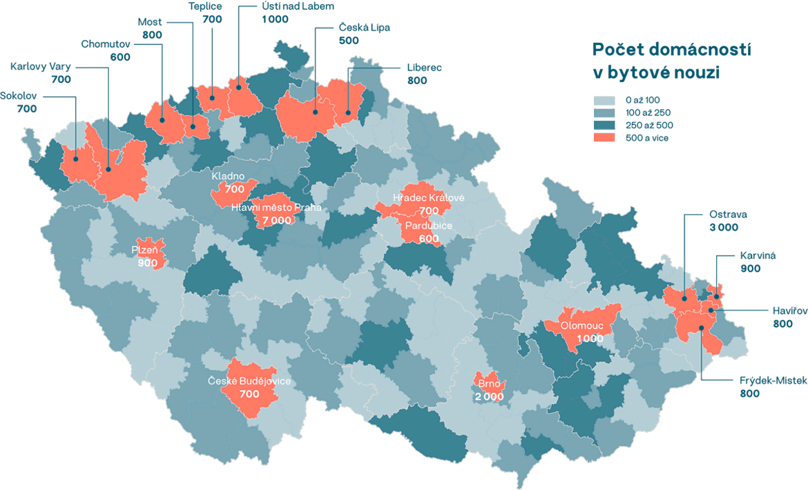 Návrh zákona o podpoře bydlení společně připravilo Ministerstvo pro místní rozvoj a Ministerstvo práce a sociálních věcí. Přestože obdobné zákony oba resorty slibovaly již v několika předchozích vládách, nikdy se návrhy nedostaly do legislativního procesu. Současná verze je propracovaná a zaslouží si realizaci, která však nebude lehká. Cílem zákona je do deseti let snížit počet lidí v bytové nouzi nejméně o třetinu ze současných asi 154 tisíc. V roce 2022 žilo v ČR v bytové nouzi přibližně 67 tisíc domácností, což je oněch přibližně 154 tisíc osob. Průměrná velikost domácnosti v bytové nouzi činila 2,28 osob na domácnost. Téměř polovina (47 %) těchto domácností žije na území dvaceti z 206 správních obvodů obcí s rozšířenou působností (ORP) a naopak, území více než poloviny ČR je bytovou nouzí zasaženo jen relativně málo. Proto by bylo vhodné věnovat primárně extrémní pozornost právě území dvaceti nejvíce ohrožených obvodů. A to i za cenu zvýšení očekávaných nákladů (viz dále). Následující obrázky ukazují počty domácností v bytové nouzi a navazující počty úvazků kontaktních míst pro bydlení v daných ORP.