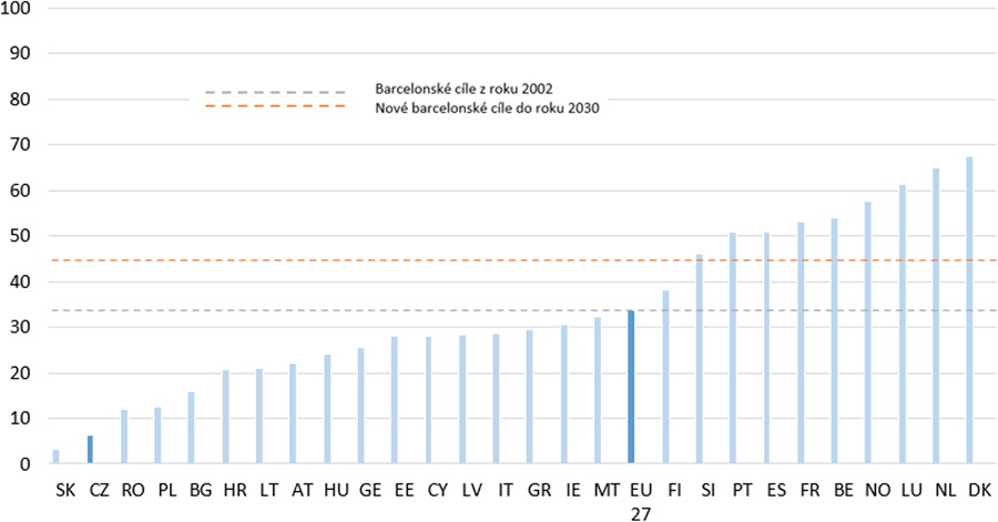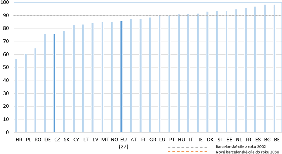 Tato doporučení (tzv. Barcelonské cíle) byla v roce 2022 upřesněna s tím, že by směřování mělo nejenom usnadnit ženám uplatnění na pracovištích, ale zároveň posílit poznávací a sociální rozvoj dětí. Členským státům je nově doporučeno, aby poskytovaly předškolní vzdělávání a péči 45 % dětí ve věku do 3 let. Ve skupině dětí ve věku od 3 let do zahájení povinné školní docházky je doporučeno dosáhnout alespoň 96 % účasti. Doporučení zmiňuje také další aspekty. Jedná se o intenzitu účasti dětí (alespoň 25 hodin týdně), o zajištění vysoké kvality služeb, cenová dostupnost, dostatečné územní pokrytí, dostatečná informovanost rodičů a spravedlivé pracovní podmínky pro zaměstnance předškolních zařízení spolu s jejich vzděláváním a odbornou přípravou. Situace v jednotlivých zemích Evropské unie je patrná z uvedených grafů 1 a 2.
