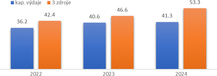 Výdaje kapitálové vzrostly o jeden procentní bod rychleji než výdaje běžné. Běžné výdaje, které tvoří většinu celkových výdajů, se meziročně zvýšily o 3 mld. Kč, ty kapitálové o 1 mld. Kč. Přebytek rozpočtu se na příjmech podílel 8 % letos, o rok dříve to bylo 5 %.
