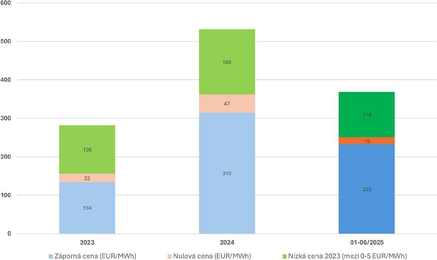Během prvních šesti měsíců zaznamenala společnost OTE na svém denním trhu 232 hodin se zápornými cenami, 19 hodin s nulovými a 118 hodin s velmi nízkými cenami (mezi 0 a 5 €/MWh). Celkem jich tedy bylo 369, o 43 víc, než za celý rok 2023. Pokud by tento trend pokračoval, překoná i rekordní rok 2024 (celkem 531 hodin).
