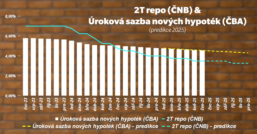 Vývoj a predikce základní úrokové sazby ČNB (2T repo) a úrokové sazby nových hypoték dle ČBA od poloviny roku 2023 do konce roku 2025