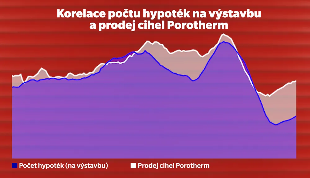 Graf ukazuje silnou korelaci mezi počtem hypoték a prodejem cihel Porotherm. Jak je patrné, vývoj obou ukazatelů se dlouhodobě pohybuje ve shodné trajektorii – růst nebo pokles hypoteční aktivity se téměř bezprostředně promítá do objemu prodeje cihel. Potvrzuje to, že hypoteční trh je spolehlivým indikátorem budoucí stavební aktivity.