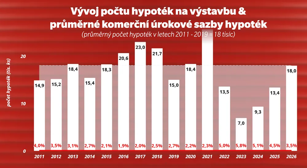 Graf znázorňuje vývoj počtu hypoték v letech 2011 až 2026 v návaznosti na průměrnou výši komerčních úrokových sazeb. Zřetelně ukazuje, že nižší úrokové sazby v minulosti vedly k vyššímu poštu poskytovaných hypoték, zatímco jejich nárůst v roce 2021 způsobil výrazný pokles o financování výstavby.