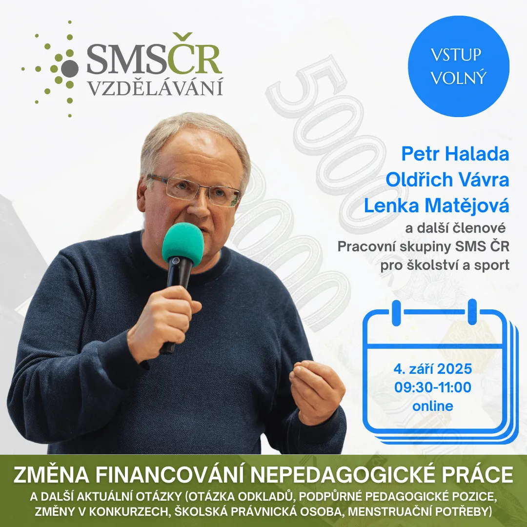 Pozor, již ve čtvrtek 4. září dopoledne se uskuteční bezplatný webinář věnovaný novinkám ve školské legislativě, zejména pak změně ve financování nepedagogů. Vystoupí na něm Petr Halada, Oldřich Vávra, Lenka Matějová a další členové Pracovní skupiny SMS ČR pro školství, sport a kulturu. Webinář je zdarma, registrovat se na něj můžete na webu SMS ČR Vzdělávání.