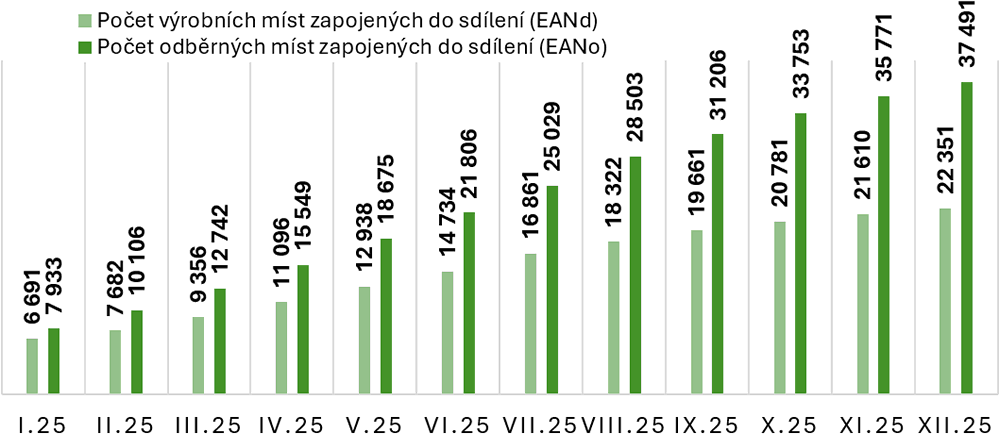V Elektroenergetickém centru k 31. prosinci 2025 zaregistrovali 22 351 výrobních a 37 491 odběrných míst. V České republice aktuálně sdílí elektřinu 19 931 aktivních zákazníků (nejčastěji jde o sdílení v režimu „sám sobě“), 864 bytových domů a 85 energetických společenství. Ti se sdružují do téměř 21 000 tzv. skupin sdílení.