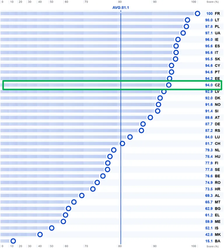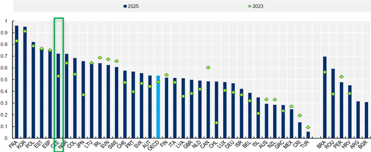 - Globální úroveň: 6. místo v OECD OURdata Indexu (skóre 0,72 oproti průměru 0,53).