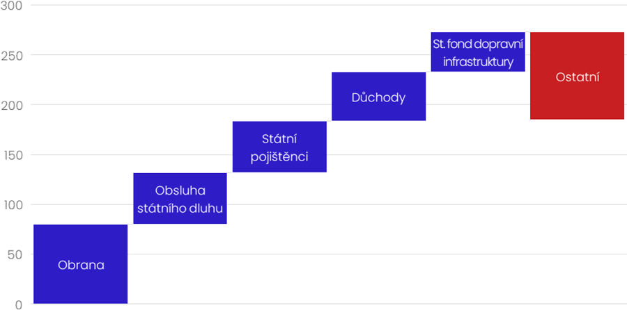 Růst rozpočtových výdajů ovlivnily zejména reakce na krizové události (pandemie, válka na Ukrajině, růst cen energií. Nejvíce narostly výdaje na obranu (80 mld. Kč), náklady na obsluhu státního dluhu, zdravotnictví a důchody (ve všech třech případech zhruba o 50 mld. Kč). Investice do dopravní infrastruktury vzrostly o 40 mld. Kč. Výdaje odráží spíše externí šoky než vědomé priority vlády, s výjimkou investic do dopravní infrastruktury. U ostatních výdajů státního rozpočtu pokračuje výrazný reálný pokles, a to včetně řady oblastí, které jsou politicky deklarovány jako prioritní (školství, věda).